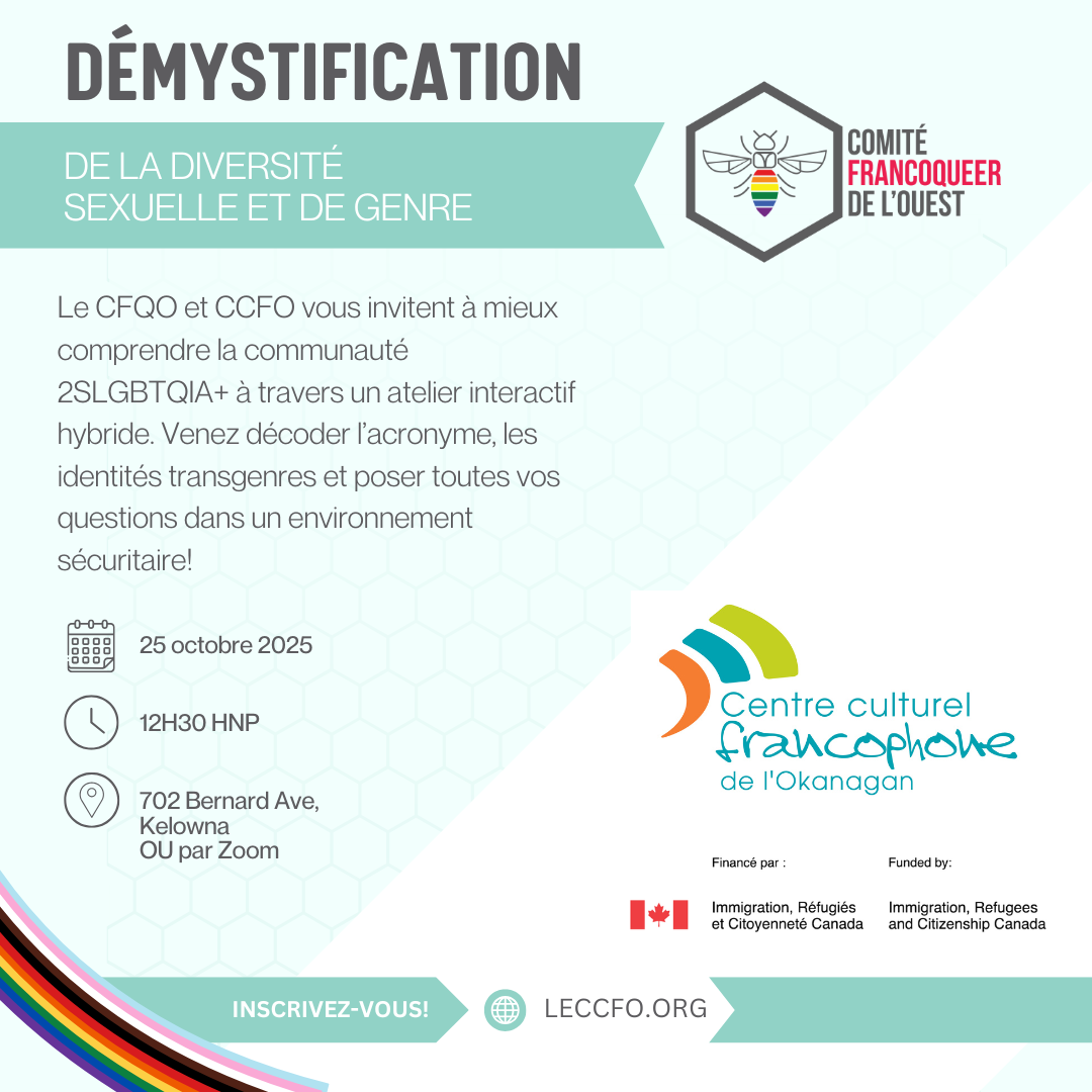 The demystification workshop is the cornerstone of CFQO’s mission. Through testimonies from 2SLGBTQIA+ Francophones, participants will learn key vocabulary and definitions to become better allies, in an engaging session with interactive activities.
